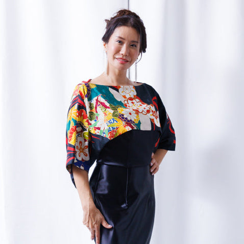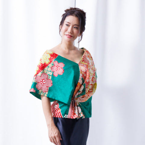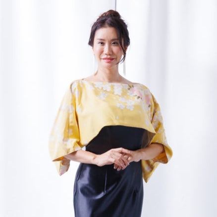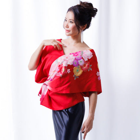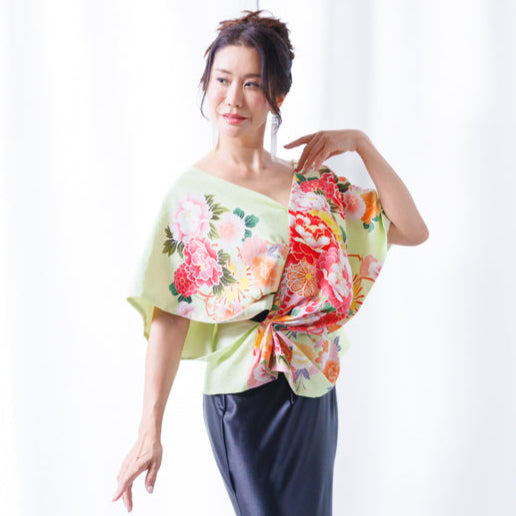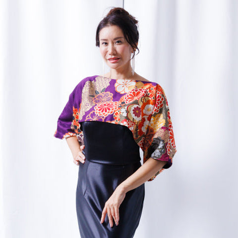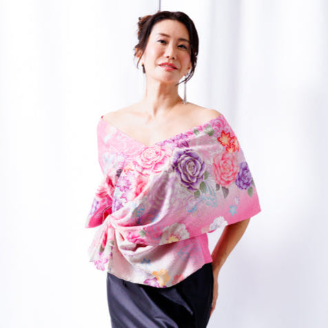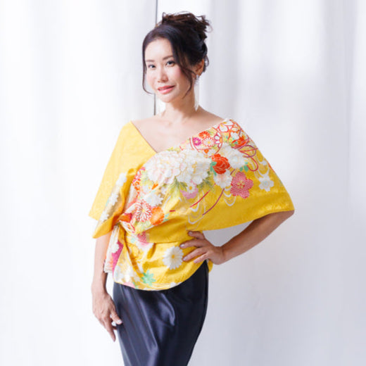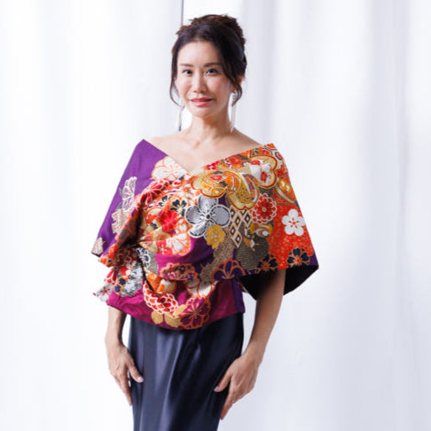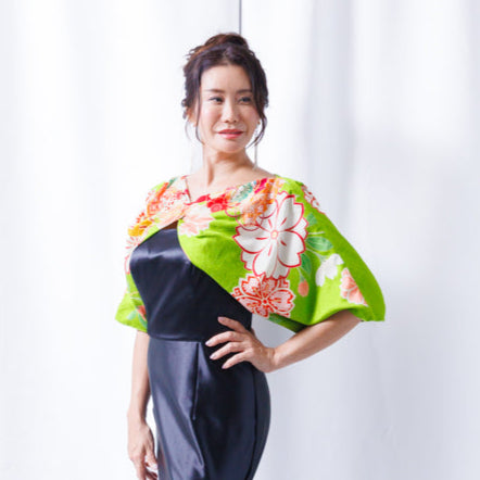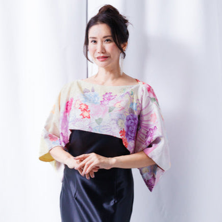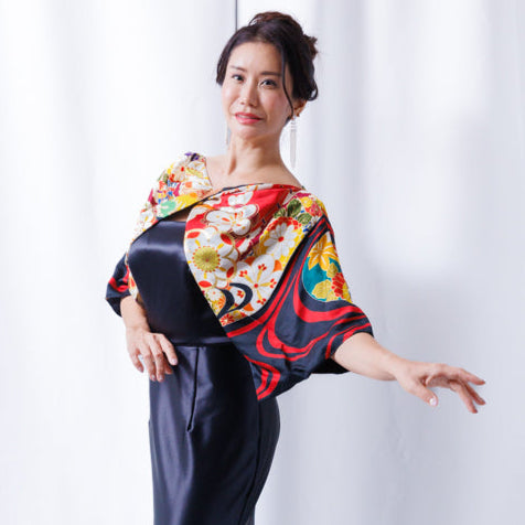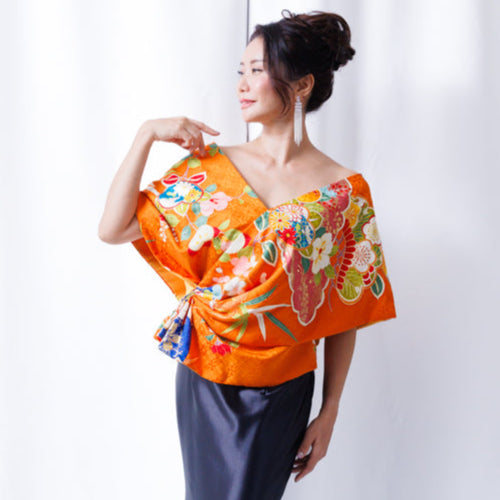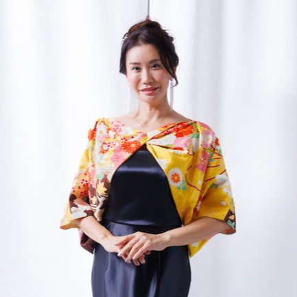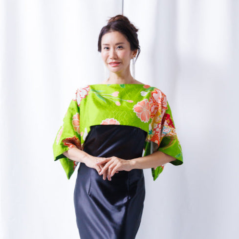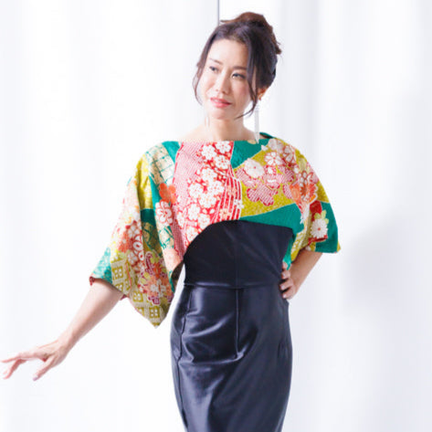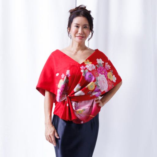 当店の着物リメイクシリーズは、未使用の振袖反物を贅沢に使い、一点一点丁寧に仕立てた正絹の晴れ着アイテムです。使用するのは「新古品」の反物。かつて婚礼や成人式のために用意された逸品である振袖や訪問着の生地は着られることなく保管されていました。高品質な正絹生地を活かし、和と洋を融合させたボレロにリメイクしています。