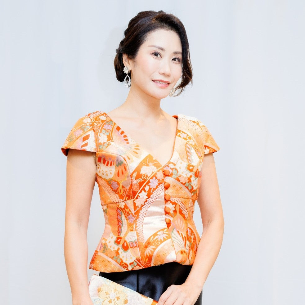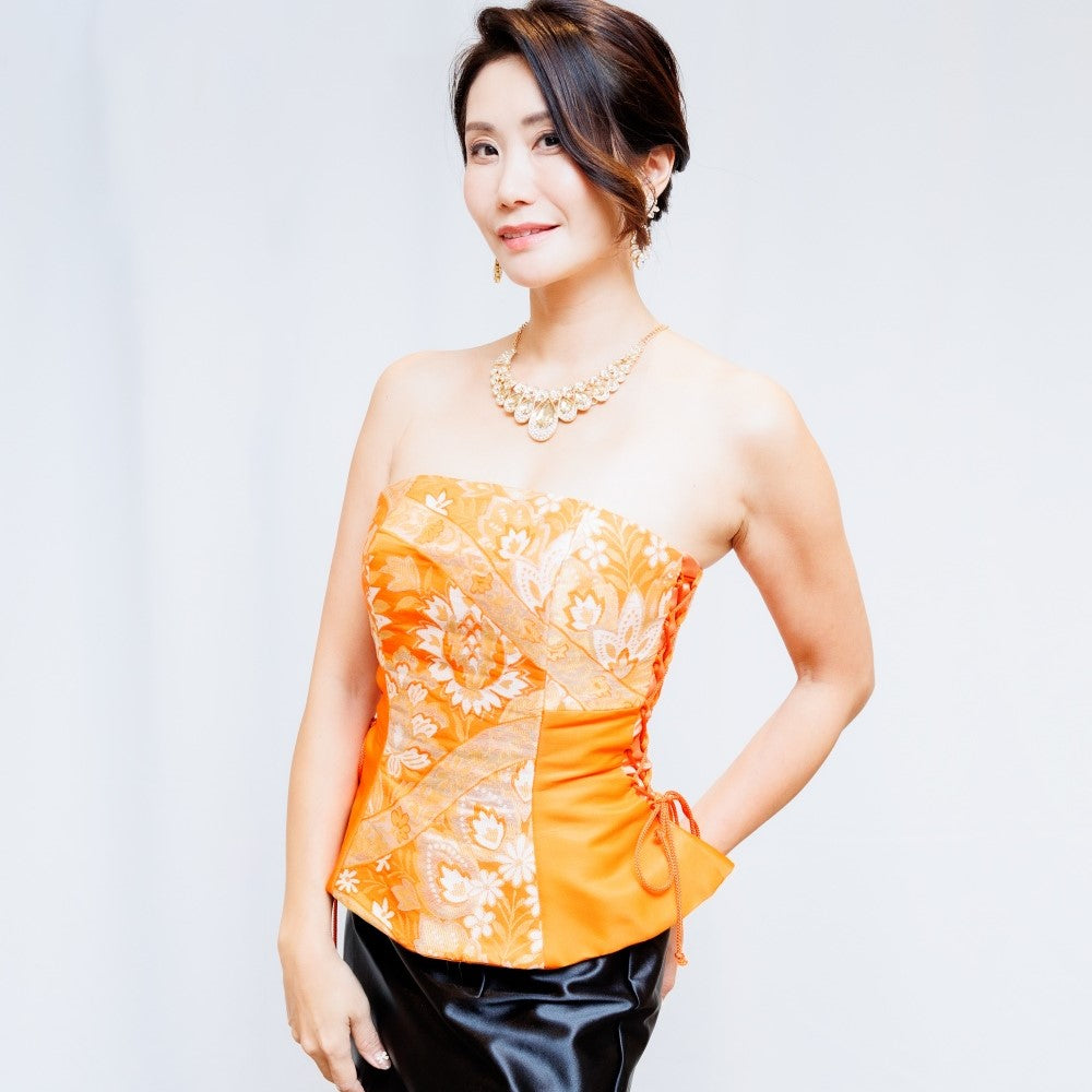 オレンジベースに金糸柄がアクセントの帯のアップサイクルのビスチェ。