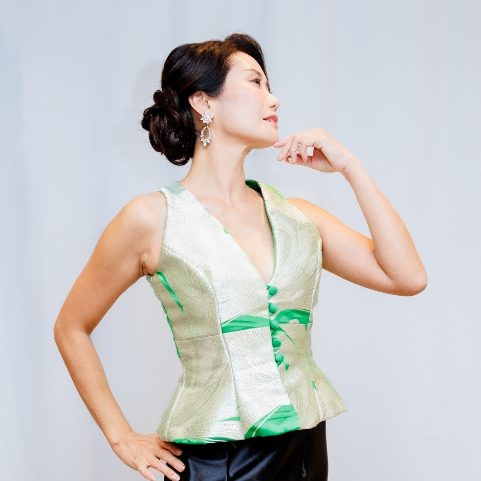 金地に赤や白の大輪の牡丹が華やかな印象の帯をビスチェにアップサイクル。