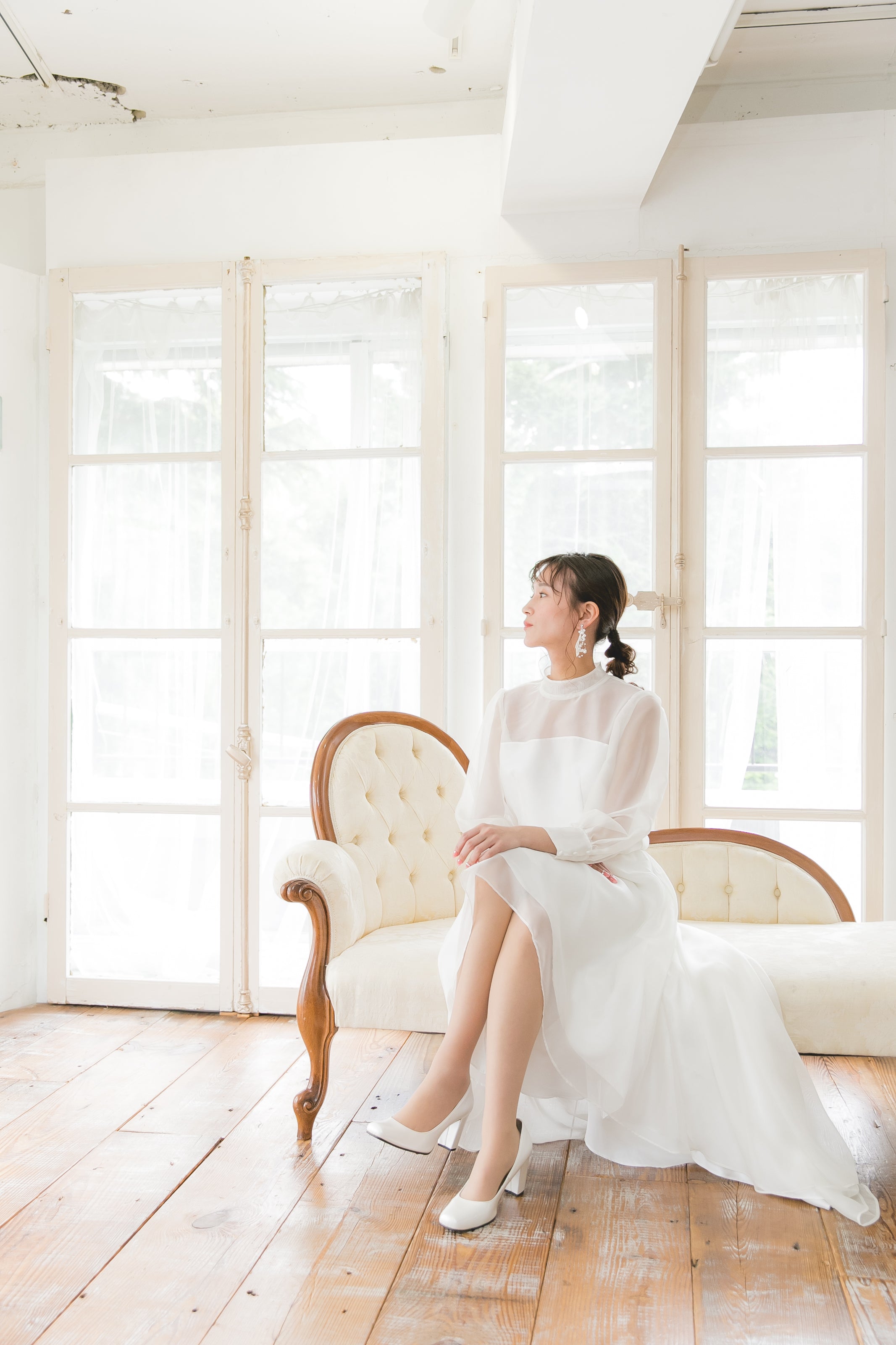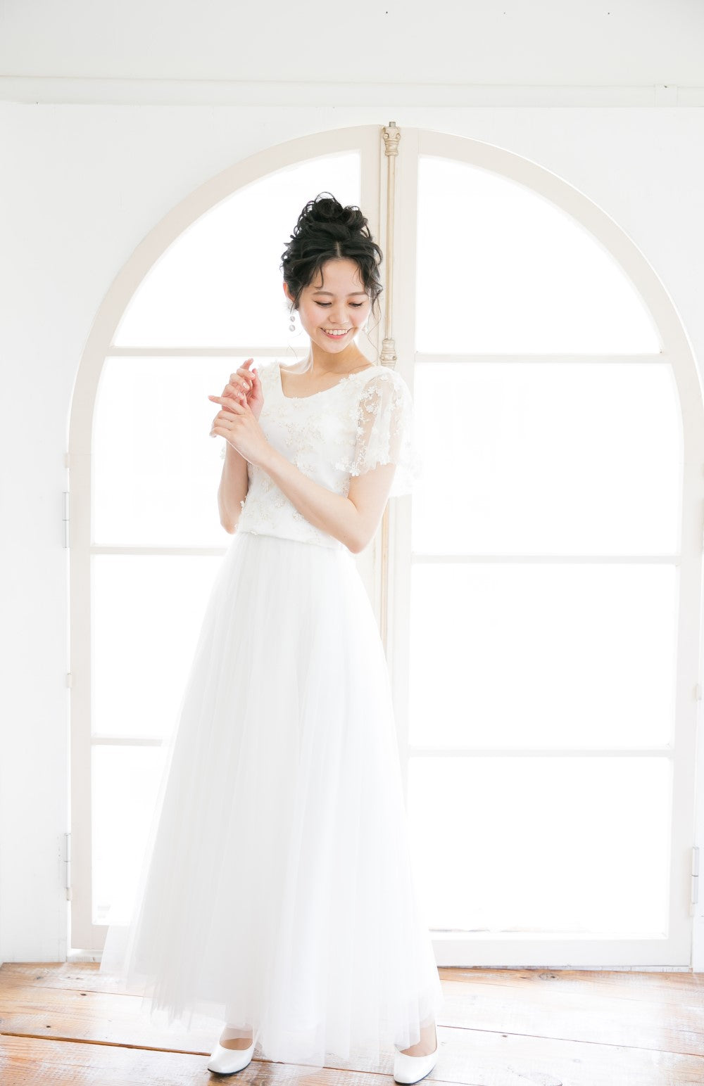 ソフトチュールの透明感あるロングスリーブはシンプルなドレスに相性がとても良いです。ゴム使用になっており二の腕部分・袖口部分に合わせるとバランスよくブラウジングされています。袖口にスカラレースがのぞきポイントになっています。
