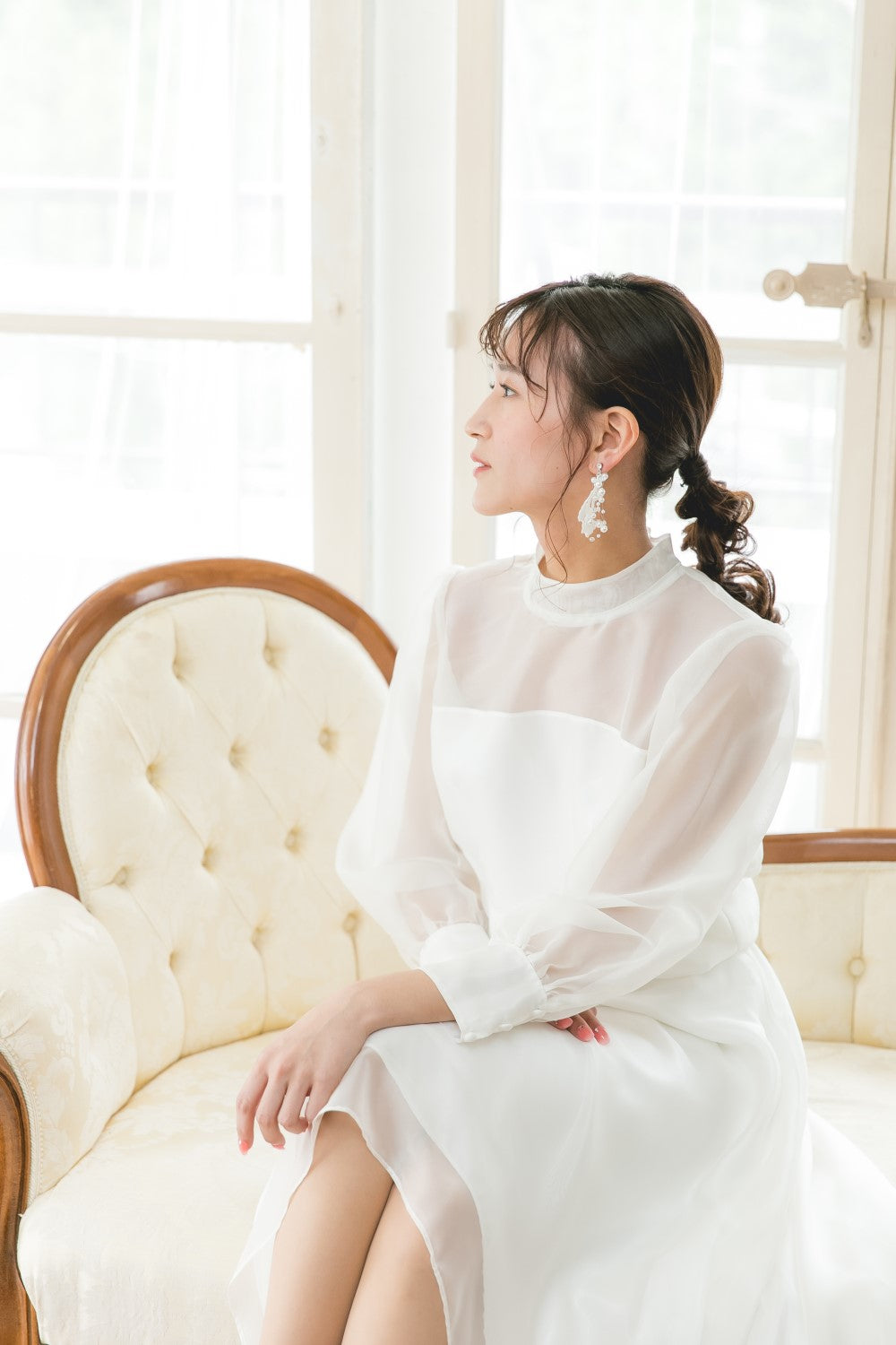 柔らかで透明感あるソフトオーガンジーのブラウス。ヨーク・袖のシースルーが品よく透き通るデザインです。スタンドカラーとロングスリーブで上品でエレガントタイプです。カフスにはクラシカルなクルミボタンをあしらってクラシカルなテイスト。そしてウェディングでも普段使いにも使用できる万能ブラウスです。