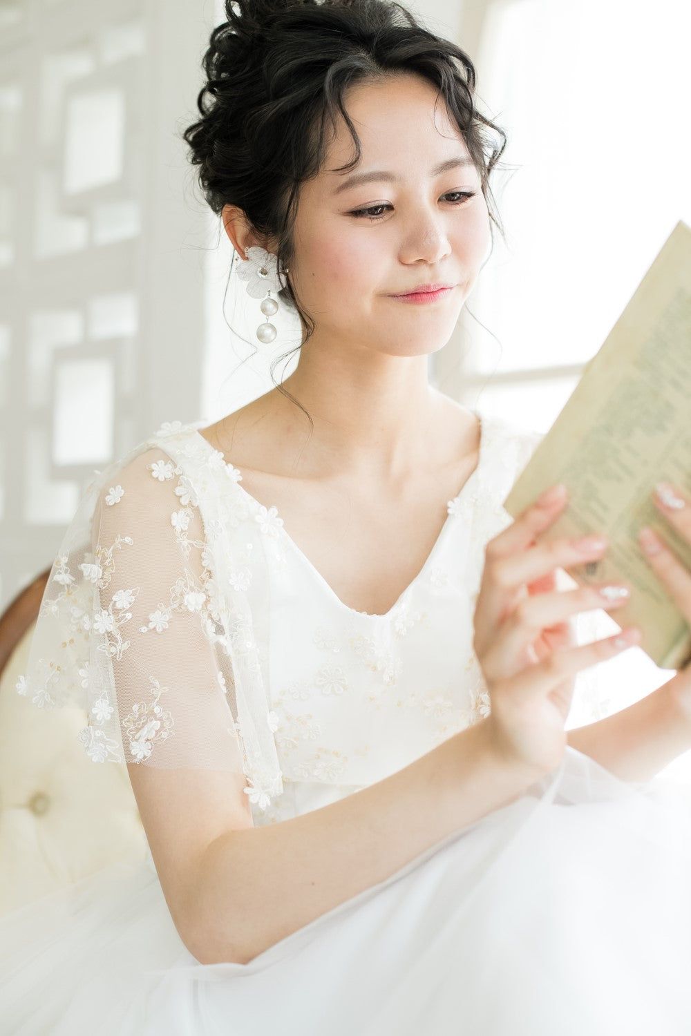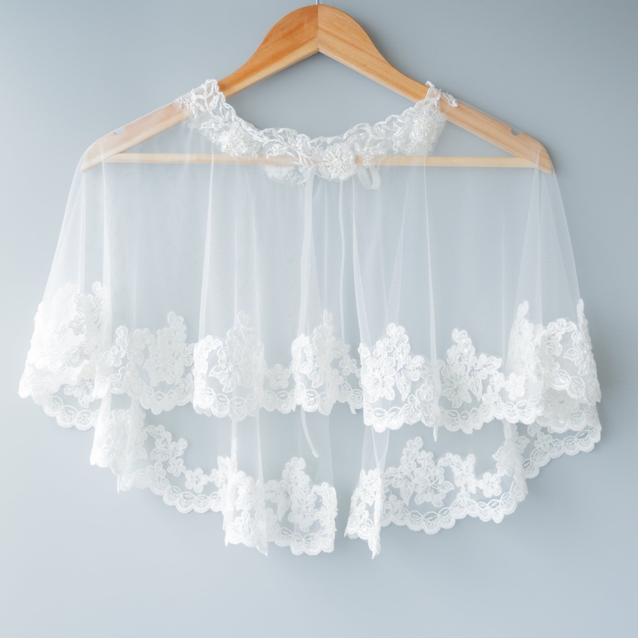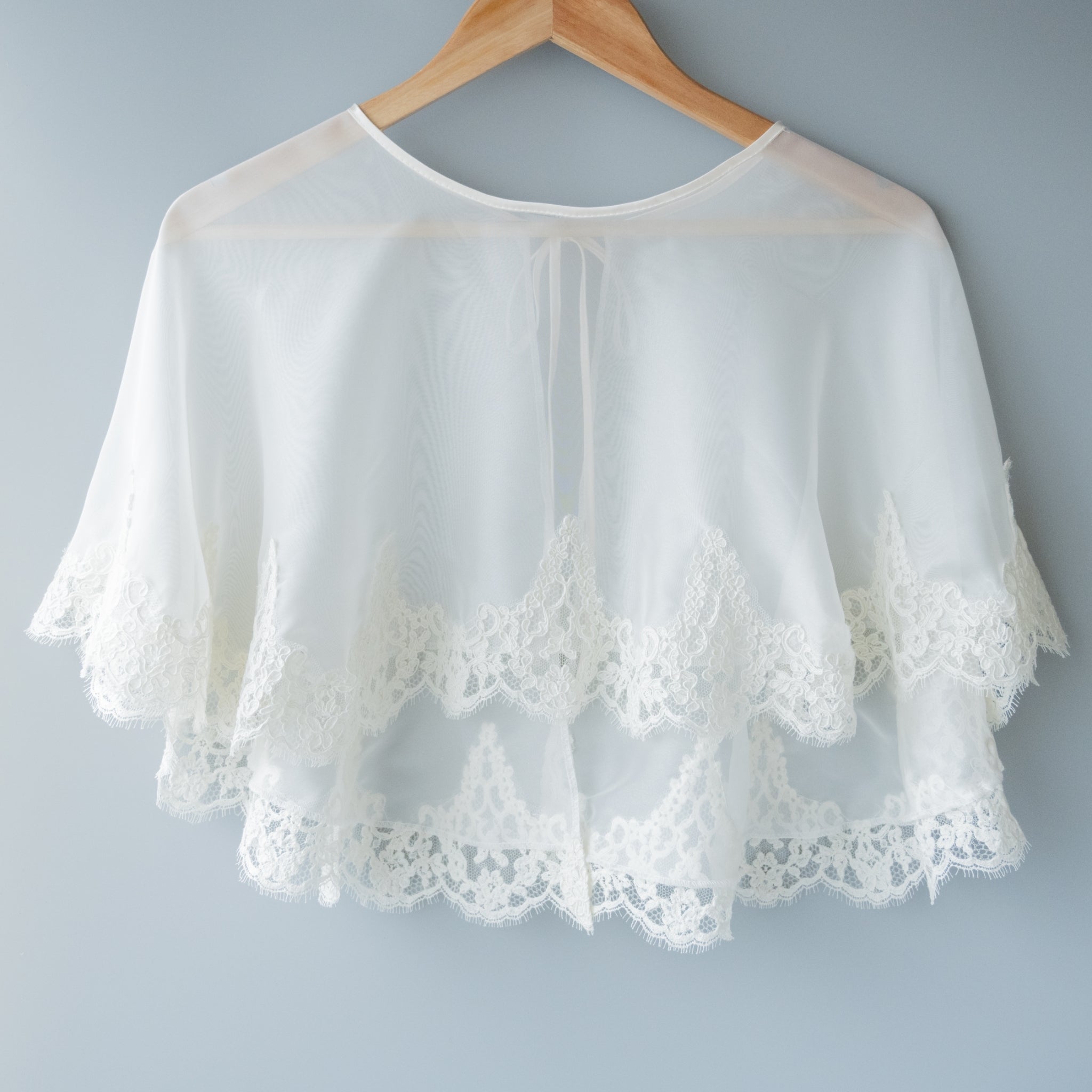 柔らかく半透明のソフトオーガンジーは肌の露出をおさえてとても上品です。縁取りにフランス製コードレースを贅沢に縁取り気品あり存在感あるデザインとなっています。アイボリーカラーとなるため合わせるドレスはアイボリーが相応しいです。