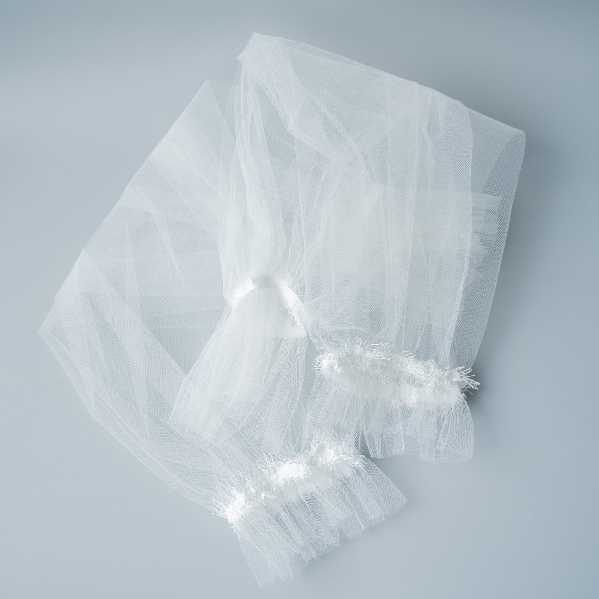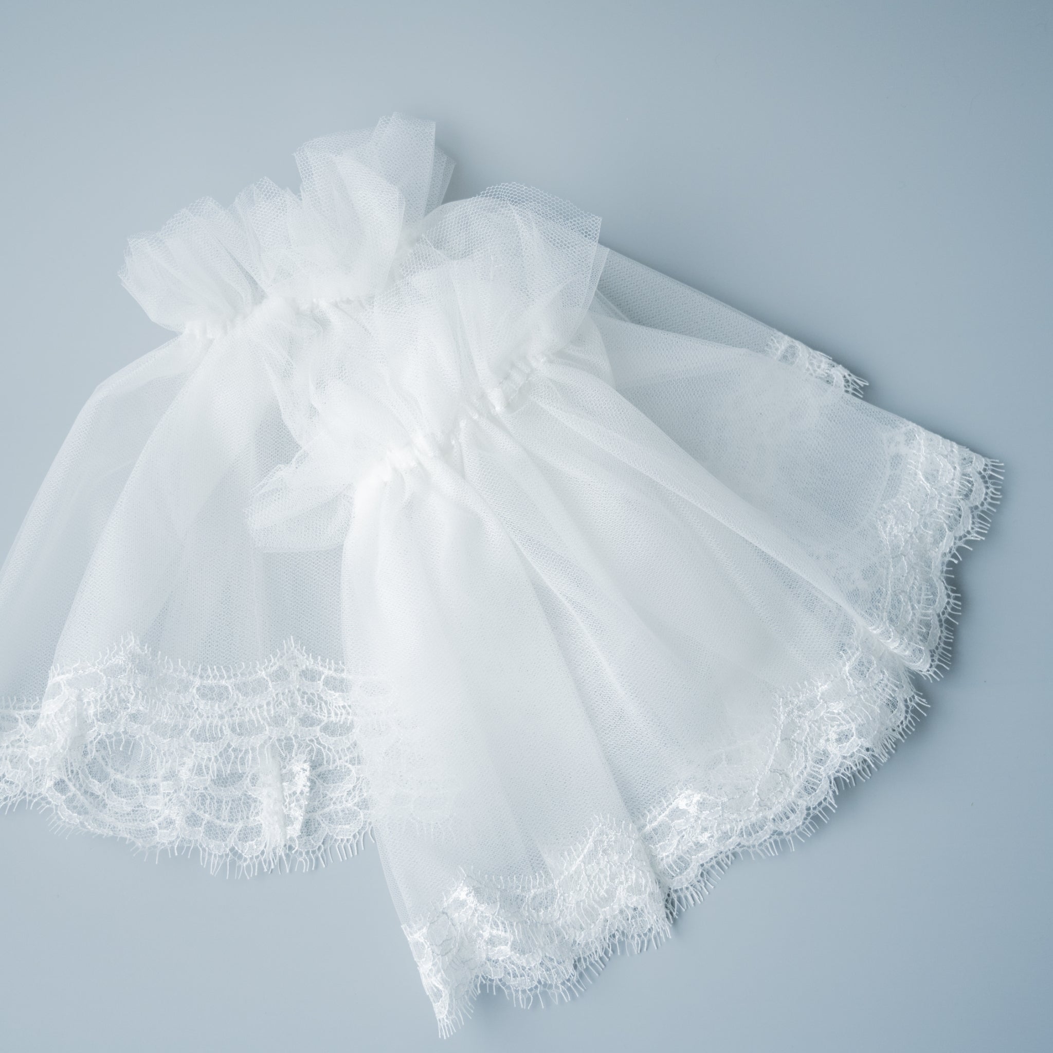 チュールが幾重にも重なり軽やかで華やかでギャザーフレーの袖。縁取りには軽やかなリバーレースのスカラップがあしらわれています。シンプルなドレスも華やかになる付け袖です。