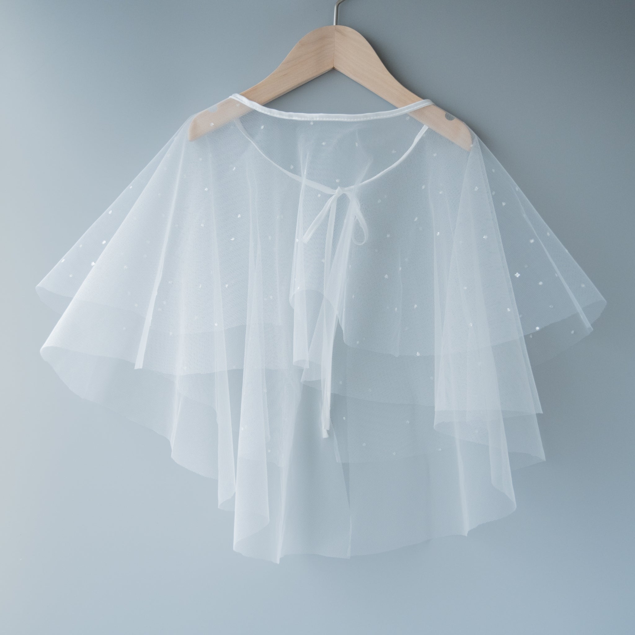 キラキラとさりげなく輝くグリッターチュールがアクセントになった軽やかなケープです。透明感あるチュール素材を使用しているのでケープが重たく見えず可憐なデザインです。ネックラインのサテンリボンがシャープにみえアクセントになっています。