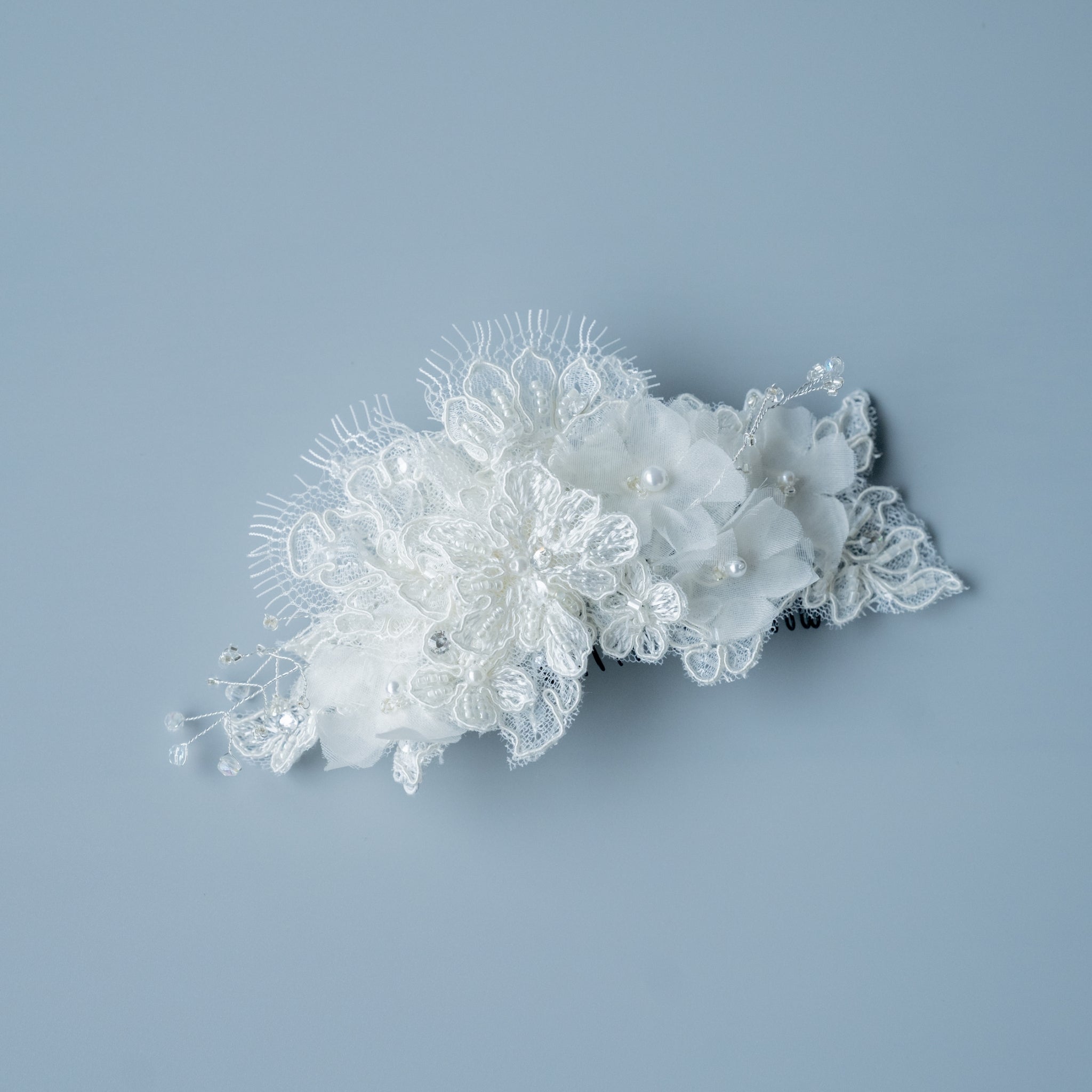 イタリア製コードレースとハンドメイドシルクフラーをミックスしたヘッドドレス。繊細でエレガントなデザインです。さりげなくカットビーズの小枝があしらわれています。