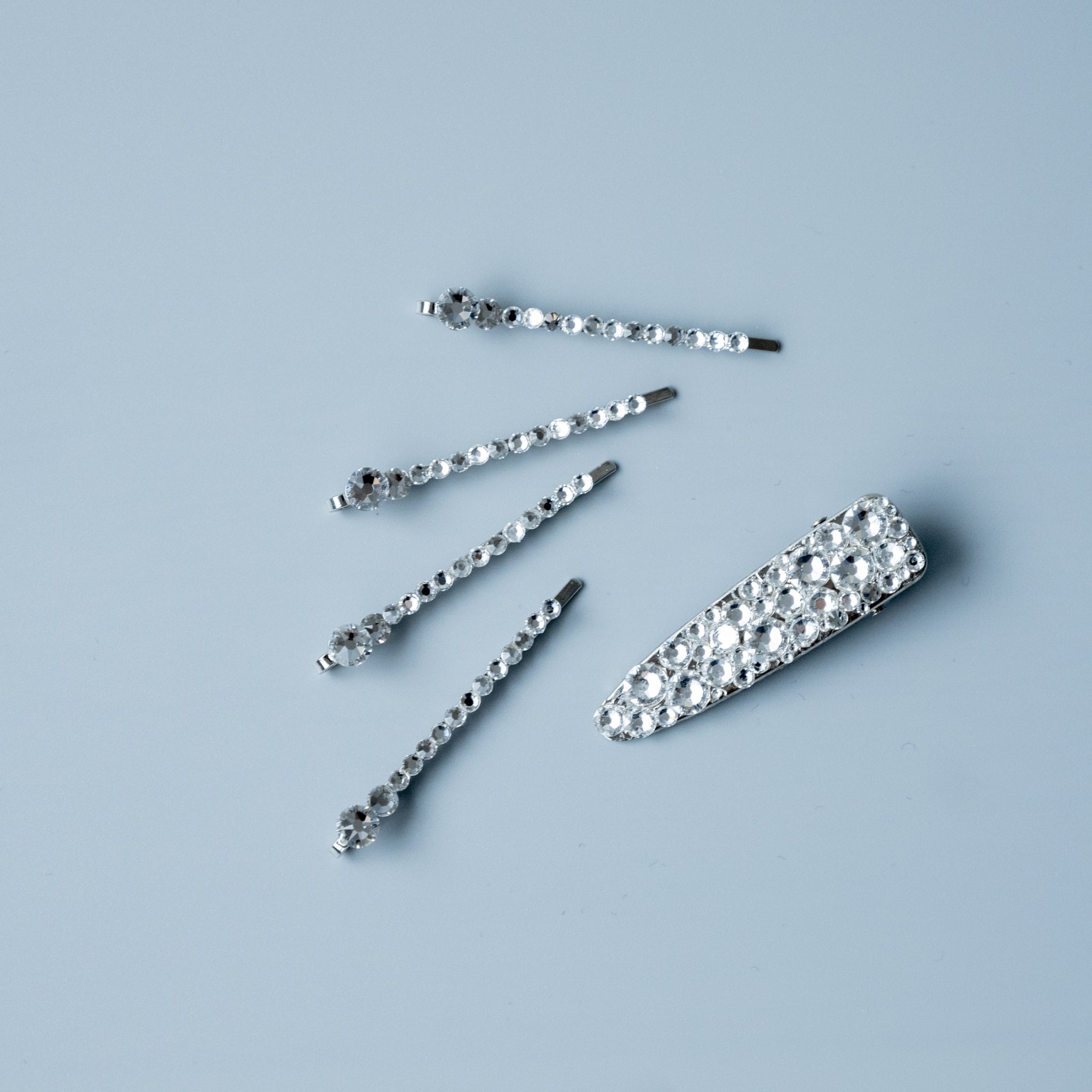 ヘアピン4本とクリップ1本のセット。ヘアピンにはキラキラ輝くスワロフスキーをライン上にあしらっています。またヘアクリップも大小のスワロフスキーをランダムにデザイン。重ね付けしたり自由にアレンジできるヘア小物です。