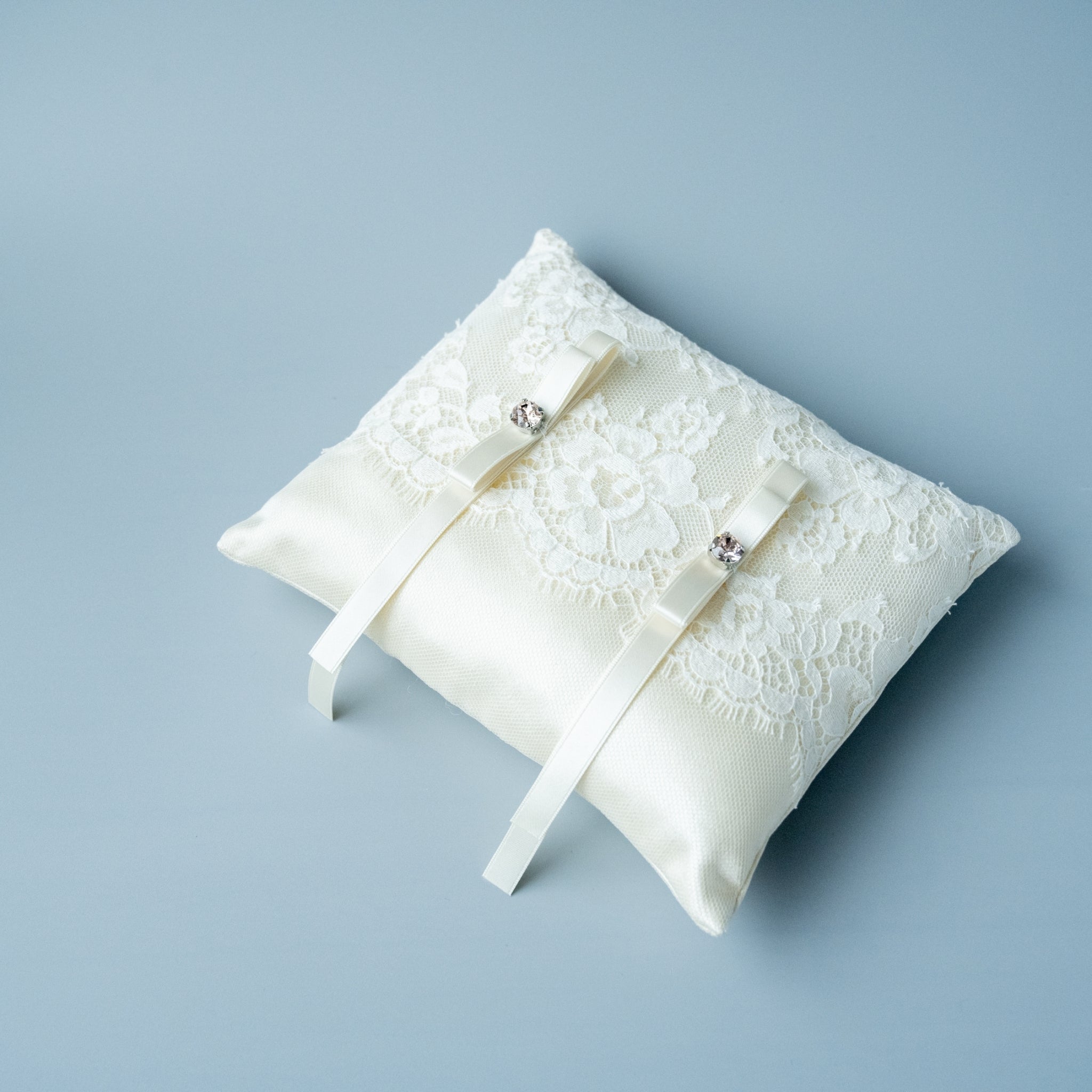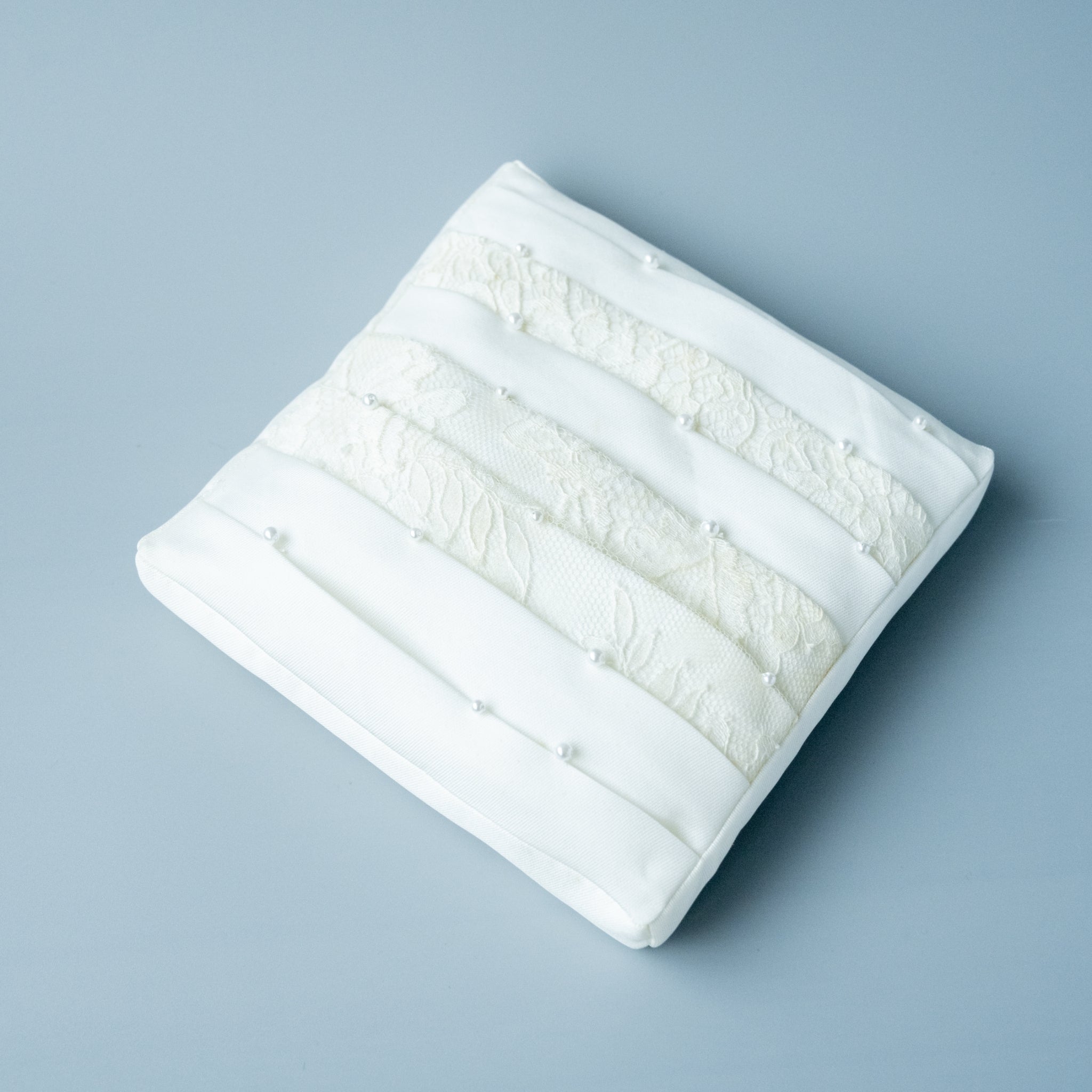 イタリア製ミカドシルクとリバーレースを使用したリングピローは均一にたっキングされて指輪を収納できるようになったモダンなデザインです。他にはない珍しいデザインが印象的です。