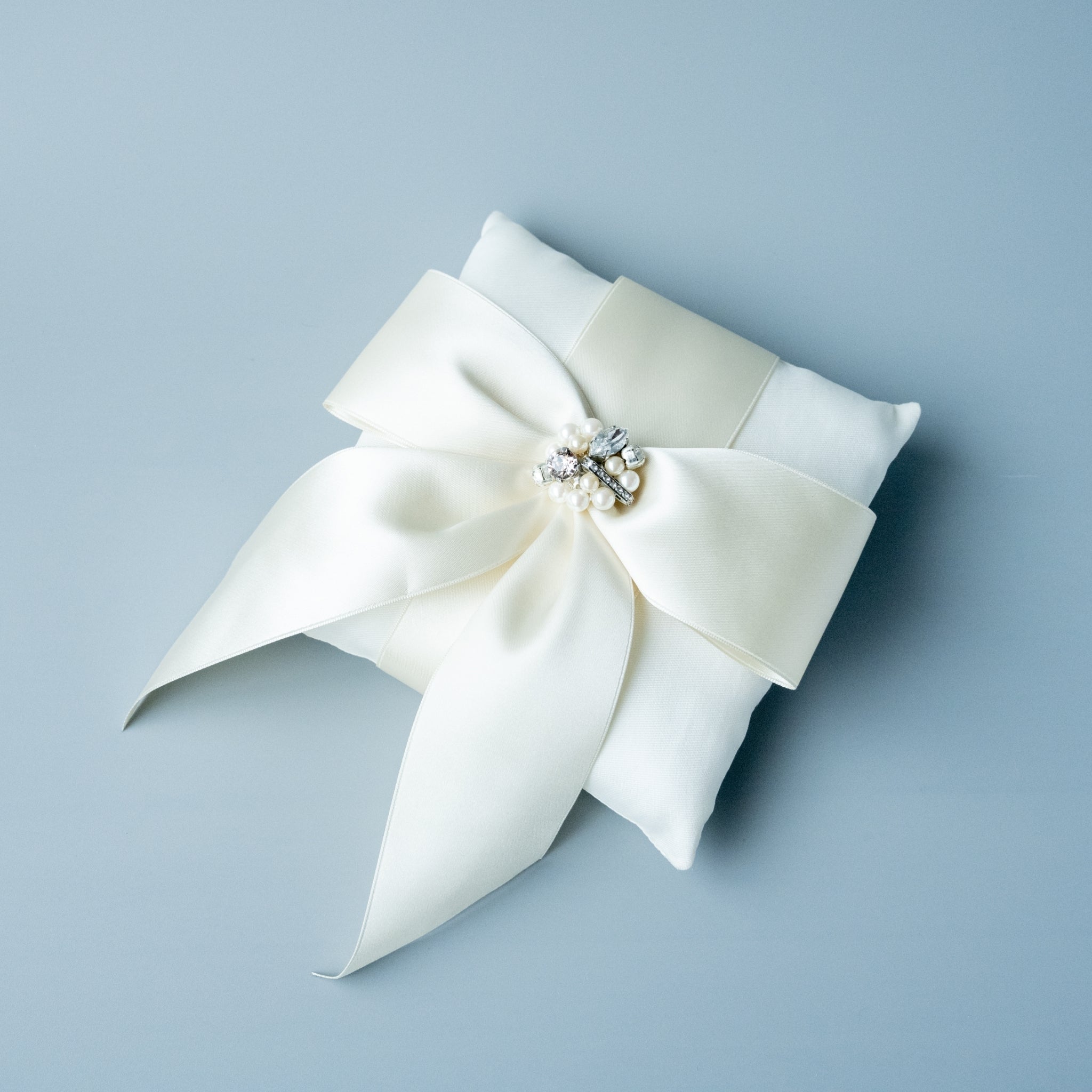 ラグジュアリーなアイボリーのビックリボンとビジューモチーフがポイントになったリングピローです。素材も贅沢にミカドシルクのピローにダブルサテンのリボンを使用しています。挙式にはリボンテールに指輪を通して使用してください。