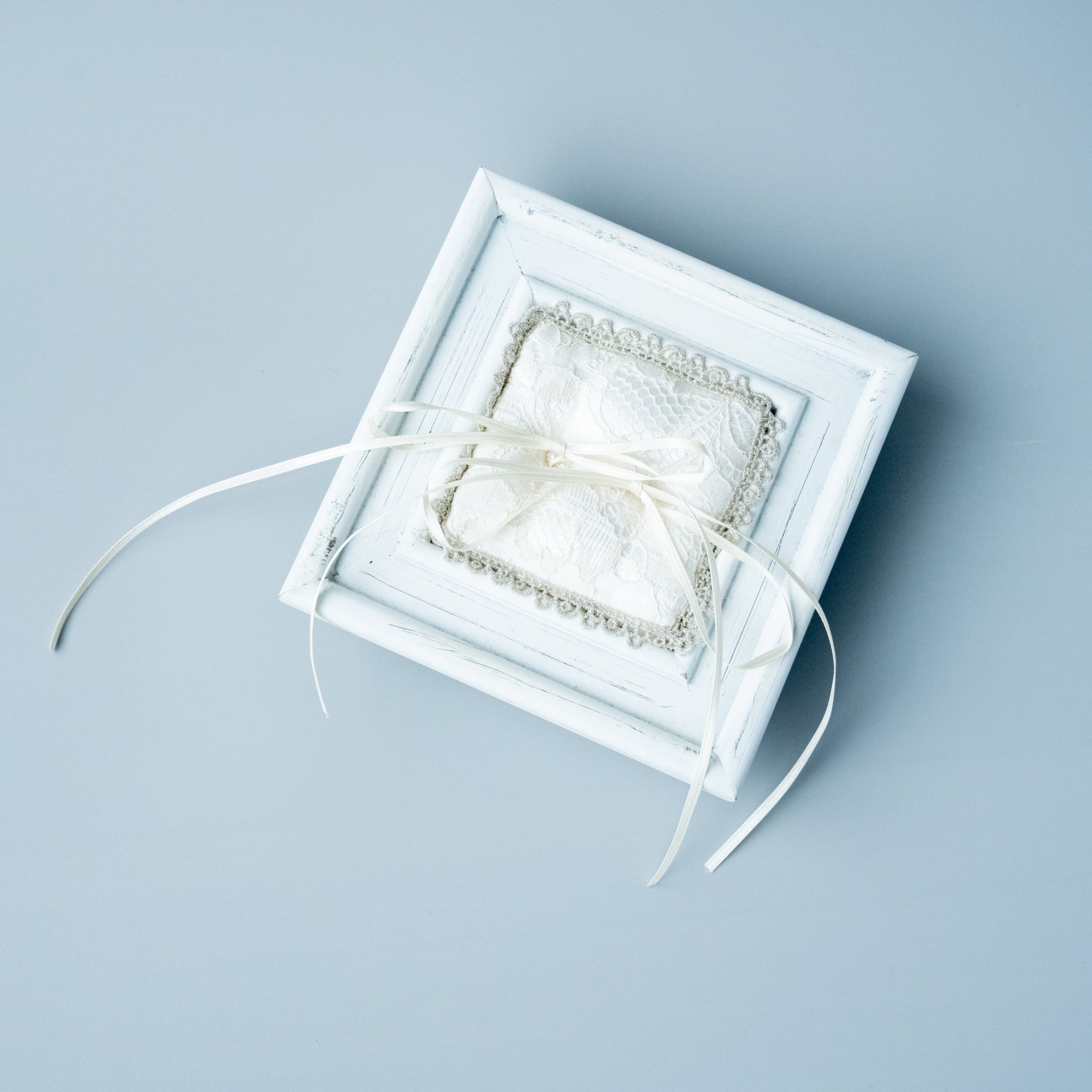 シャビーブルーのフレーム内にアンティークなレースベースのクッションを引きつめたオシャレなリングピローです。リボンに指輪を結んで使用してください。挙式後は立て掛けて飾ることもできます。