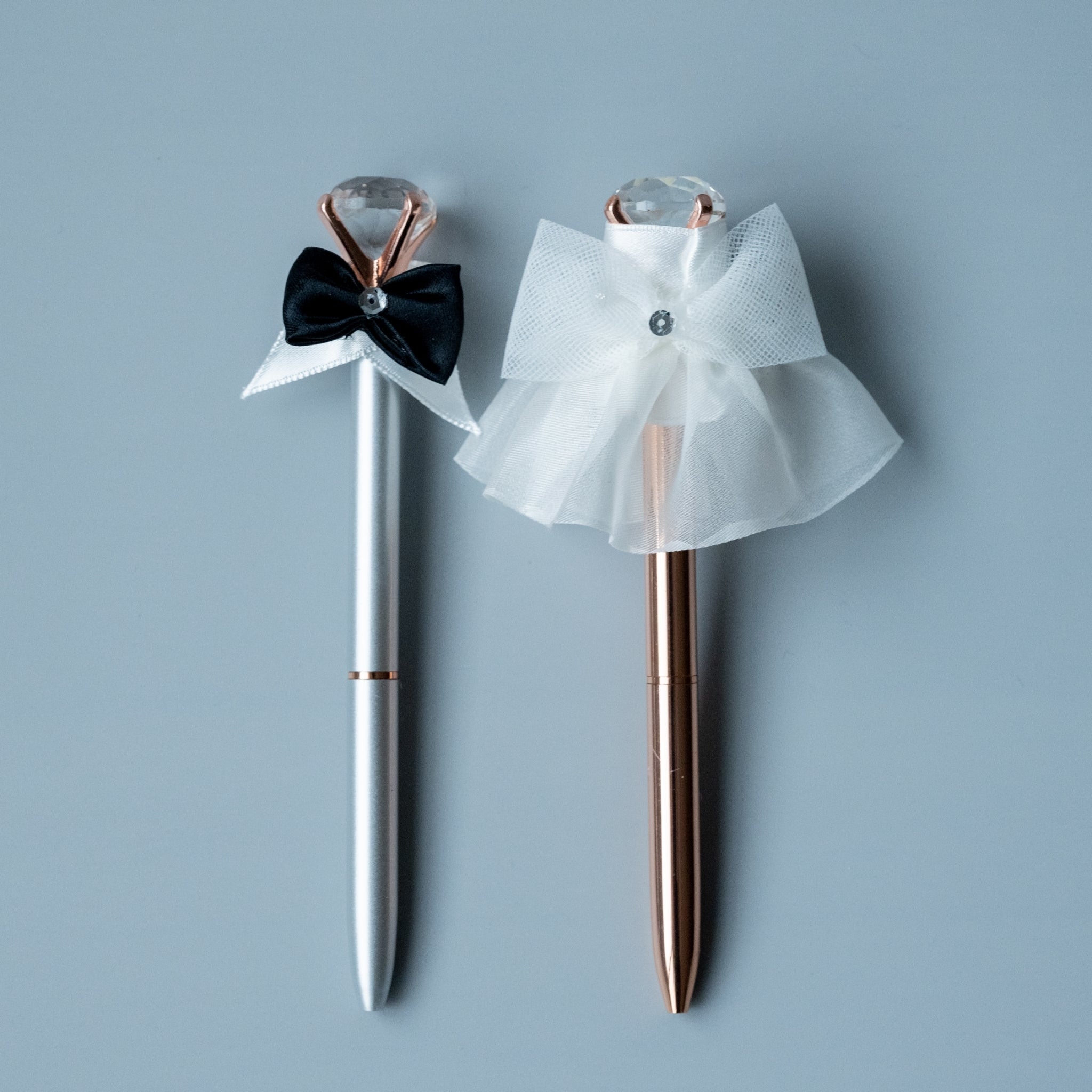 愛らしいボールペンに花嫁と花婿の衣装をデコレーションしています。花嫁はオフホワイトのドレス。花婿は黒タイをデザインしかわいらしいイメージに仕上げました。結婚式の受付などで使用すると下種物喜んでくれるはずです。(2本セット)
