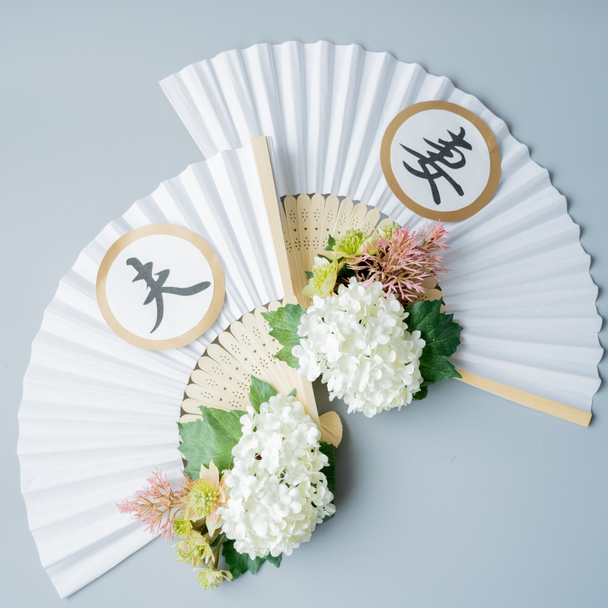 白扇2本と文字のアーティフィシャルフラワーなど扇子プロップスに必要な小物がセットのなったキットです。