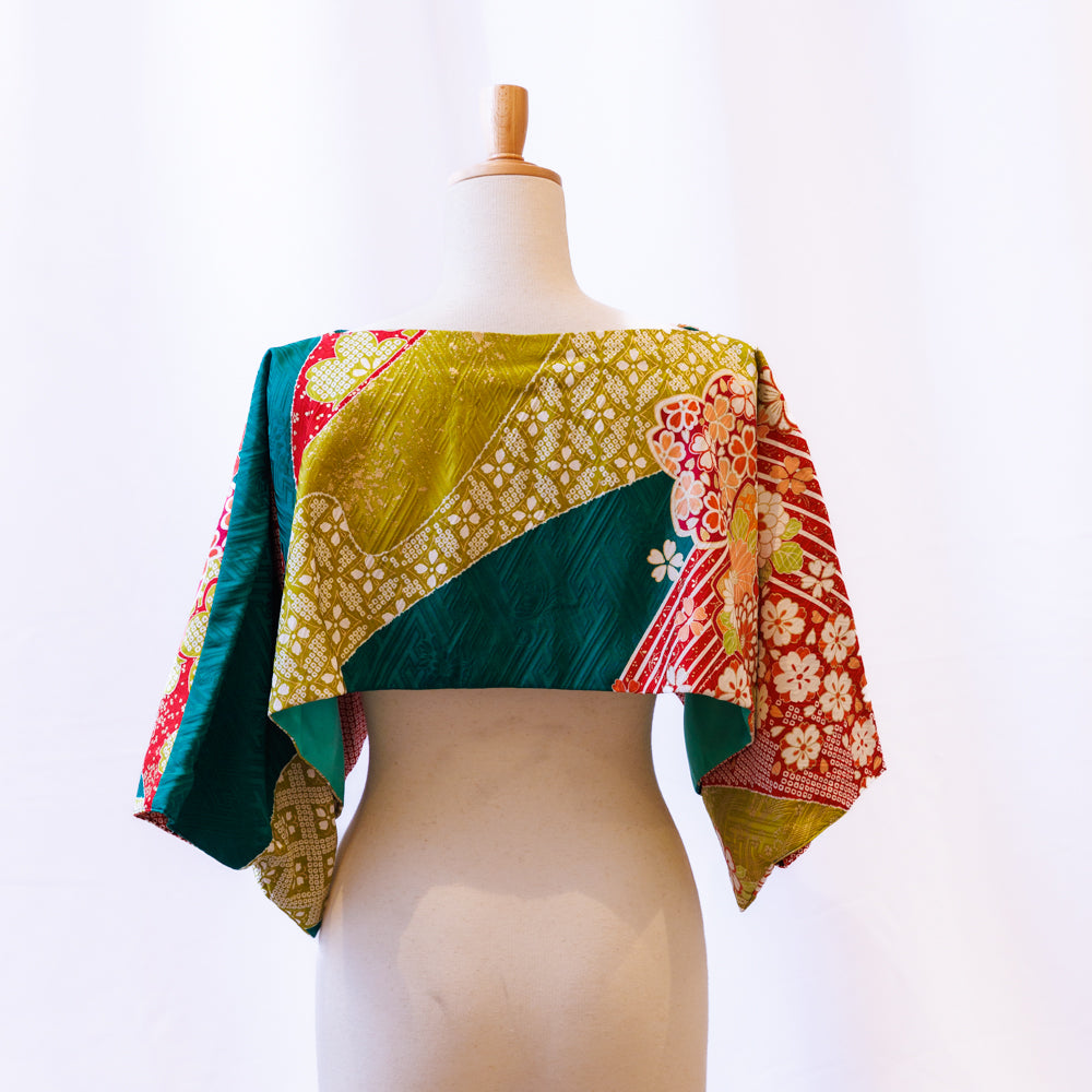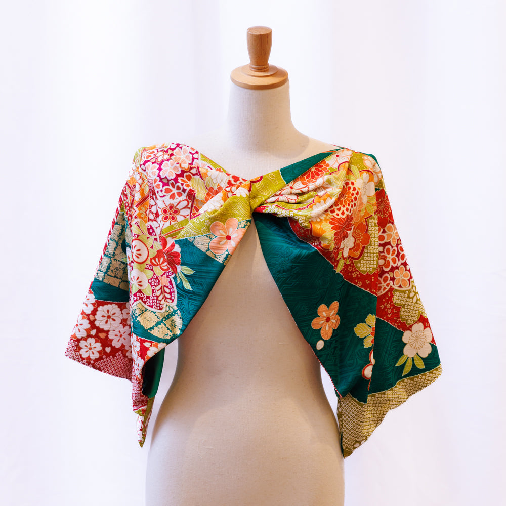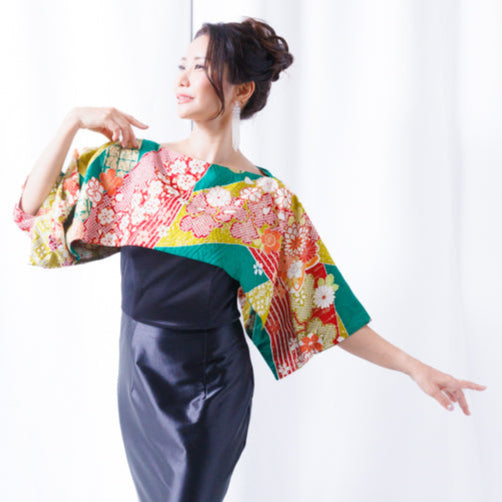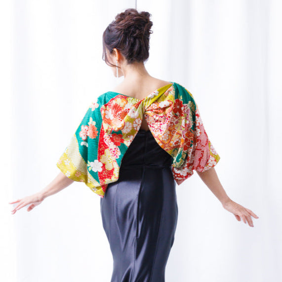 当店の着物リメイクシリーズは、未使用の振袖反物を贅沢に使い、一点一点丁寧に仕立てた正絹の晴れ着アイテムです。使用するのは「新古品」の反物。かつて婚礼や成人式のために用意された逸品である振袖や訪問着の生地は着られることなく保管されていました。高品質な正絹生地を活かし、和と洋を融合させたボレロにリメイクしています。