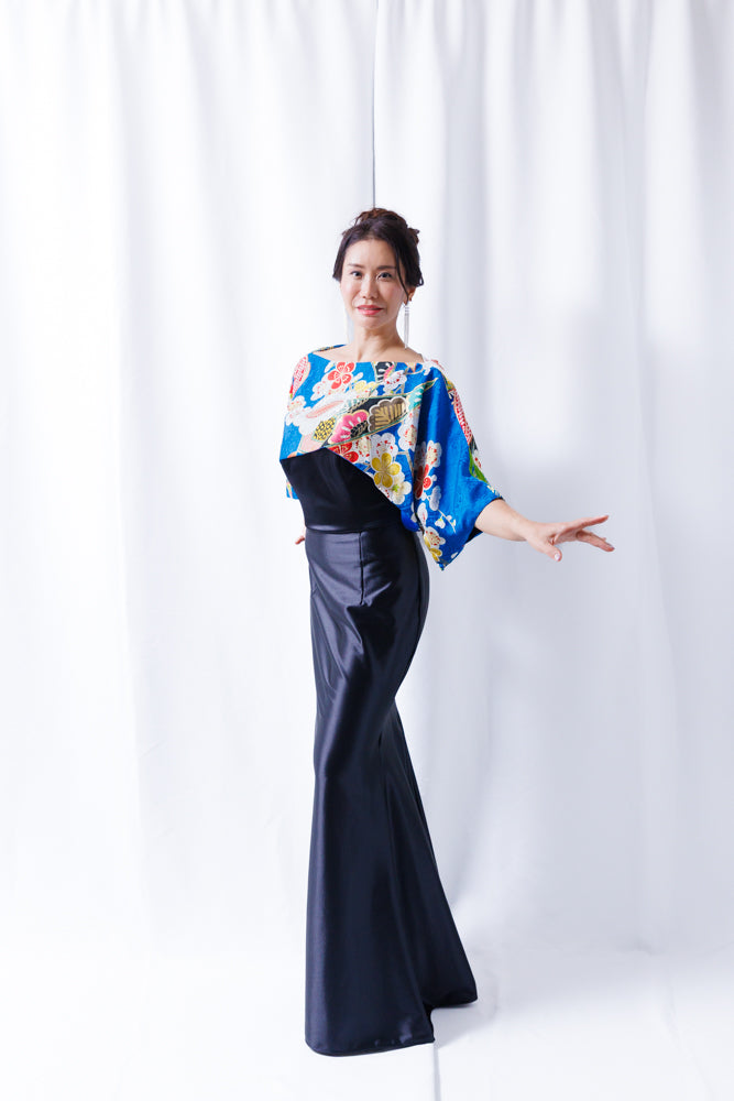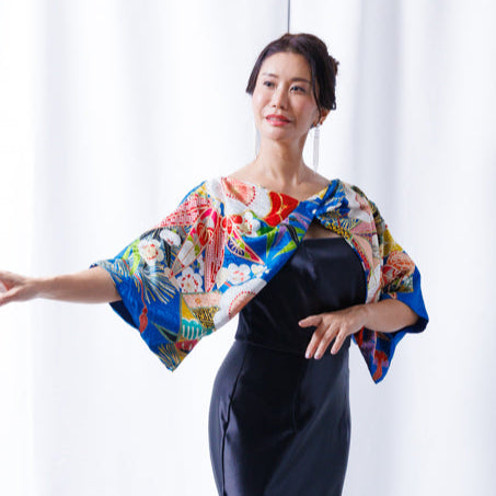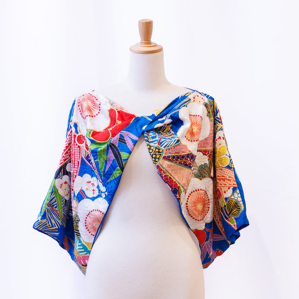 使用するのは「新古品」の反物。かつて婚礼や成人式のために用意された逸品である振袖や訪問着の生地は着られることなく保管されていました。高品質な正絹生地を活かし、和と洋を融合させたボレロにリメイクしています。