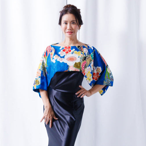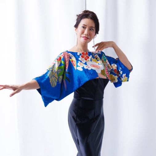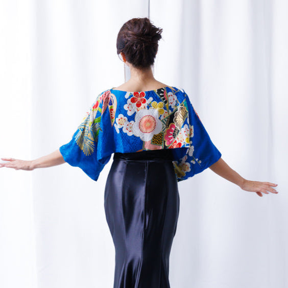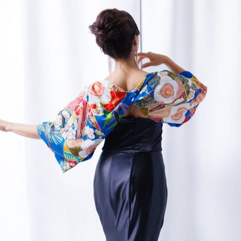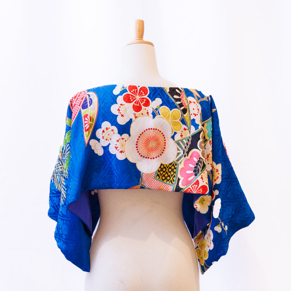 当店の着物リメイクシリーズは、未使用の振袖反物を贅沢に使い、一点一点丁寧に仕立てた正絹の晴れ着アイテムです。使用するのは「新古品」の反物。かつて婚礼や成人式のために用意された逸品である振袖や訪問着の生地は着られることなく保管されていました。高品質な正絹生地を活かし、和と洋を融合させたボレロにリメイクしています。