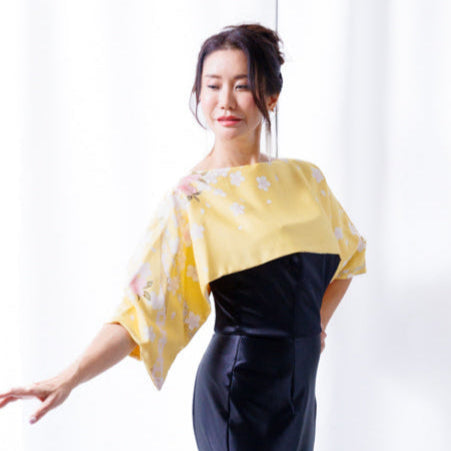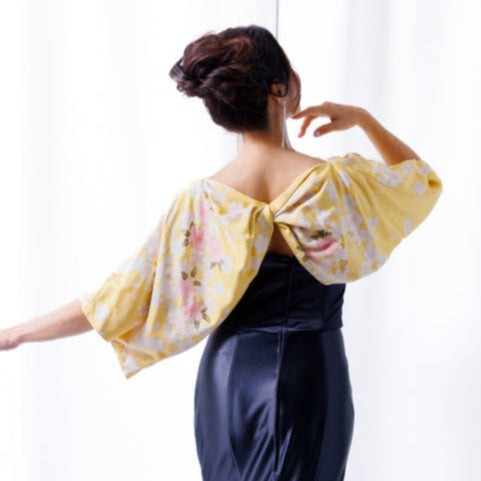 当店の着物リメイクシリーズは、未使用の振袖反物を贅沢に使い、一点一点丁寧に仕立てた正絹の晴れ着アイテムです。使用するのは「新古品」の反物。かつて婚礼や成人式のために用意された逸品である振袖や訪問着の生地は着られることなく保管されていました。高品質な正絹生地を活かし、和と洋を融合させたボレロにリメイクしています。