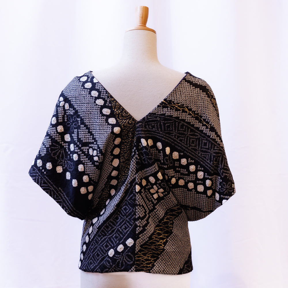 使用するのは「新古品」の反物。かつて婚礼や成人式のために用意された逸品である振袖や訪問着の生地は着られることなく保管されていました。高品質な正絹生地を活かし、和と洋を融合させたボレロにリメイクしています。