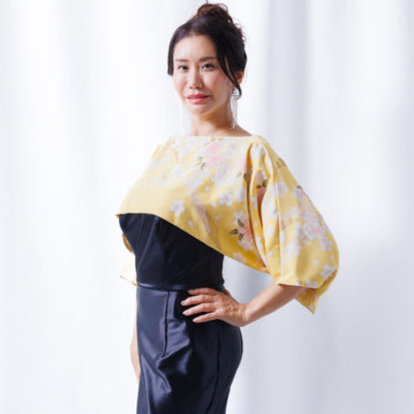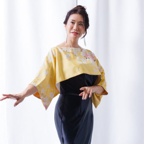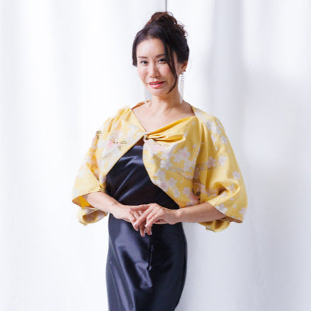 使用するのは「新古品」の反物。かつて婚礼や成人式のために用意された逸品である振袖や訪問着の生地は着られることなく保管されていました。高品質な正絹生地を活かし、和と洋を融合させたボレロにリメイクしています。