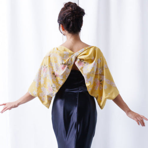 当店の着物リメイクシリーズは、未使用の振袖反物を贅沢に使い、一点一点丁寧に仕立てた正絹の晴れ着アイテムです。使用するのは「新古品」の反物。かつて婚礼や成人式のために用意された逸品である振袖や訪問着の生地は着られることなく保管されていました。高品質な正絹生地を活かし、和と洋を融合させたボレロにリメイクしています。
