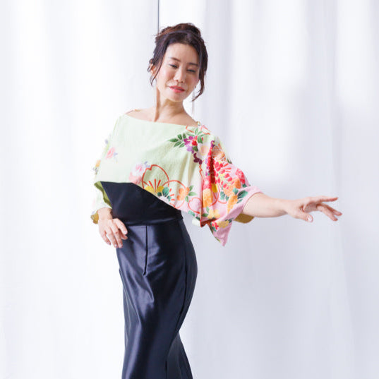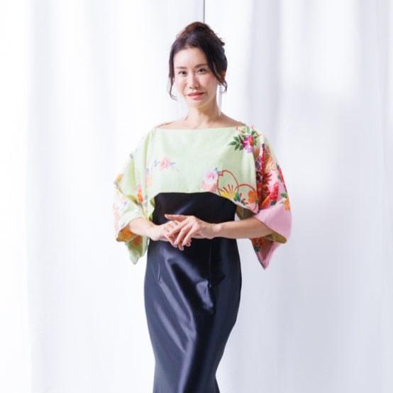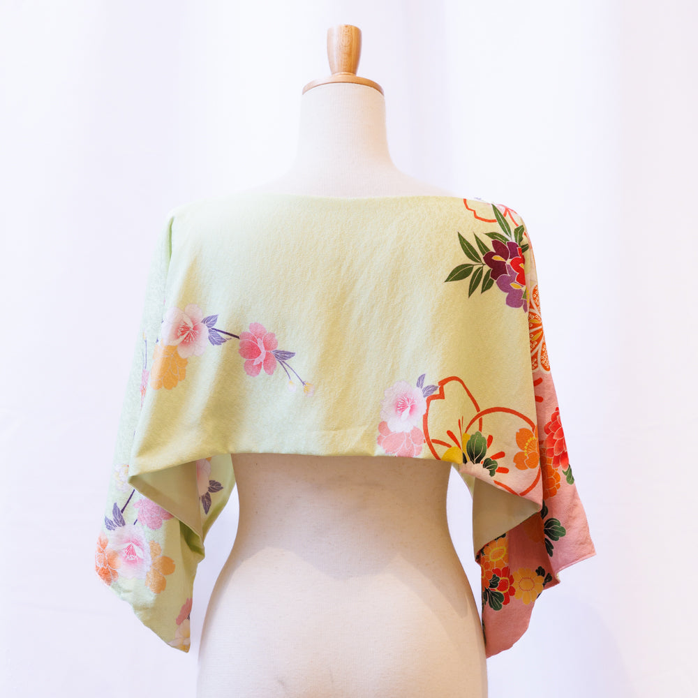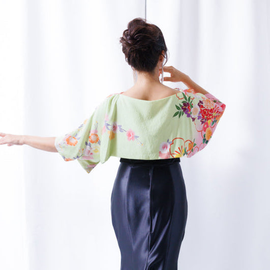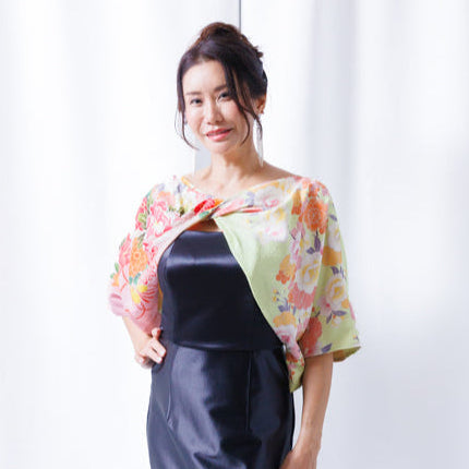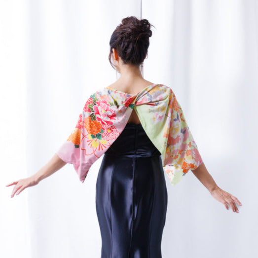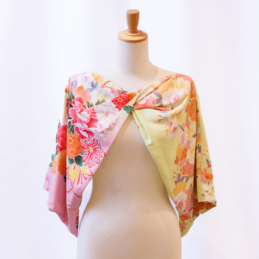 使用するのは「新古品」の反物。かつて婚礼や成人式のために用意された逸品である振袖や訪問着の生地は着られることなく保管されていました。高品質な正絹生地を活かし、和と洋を融合させたボレロにリメイクしています。